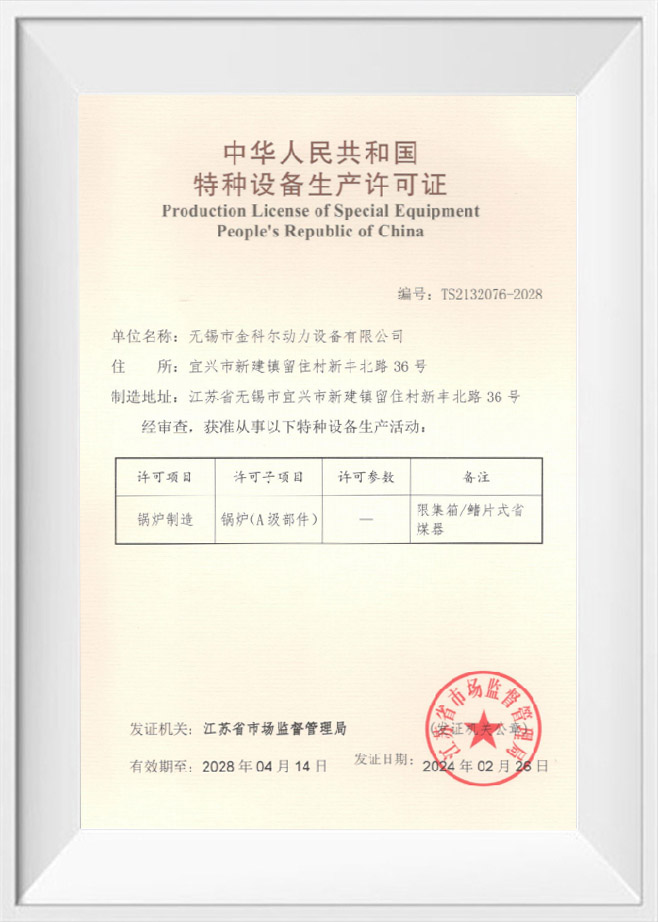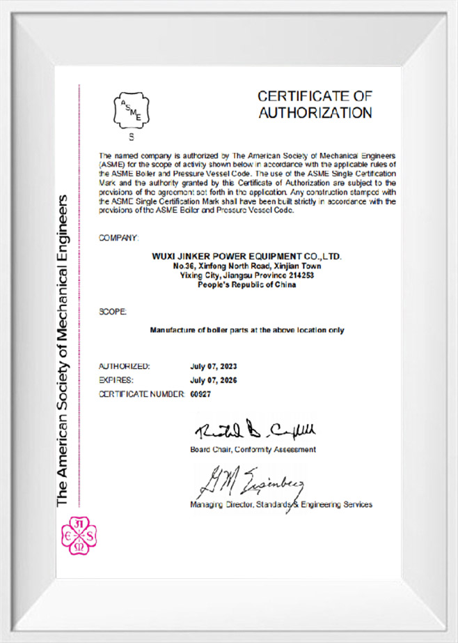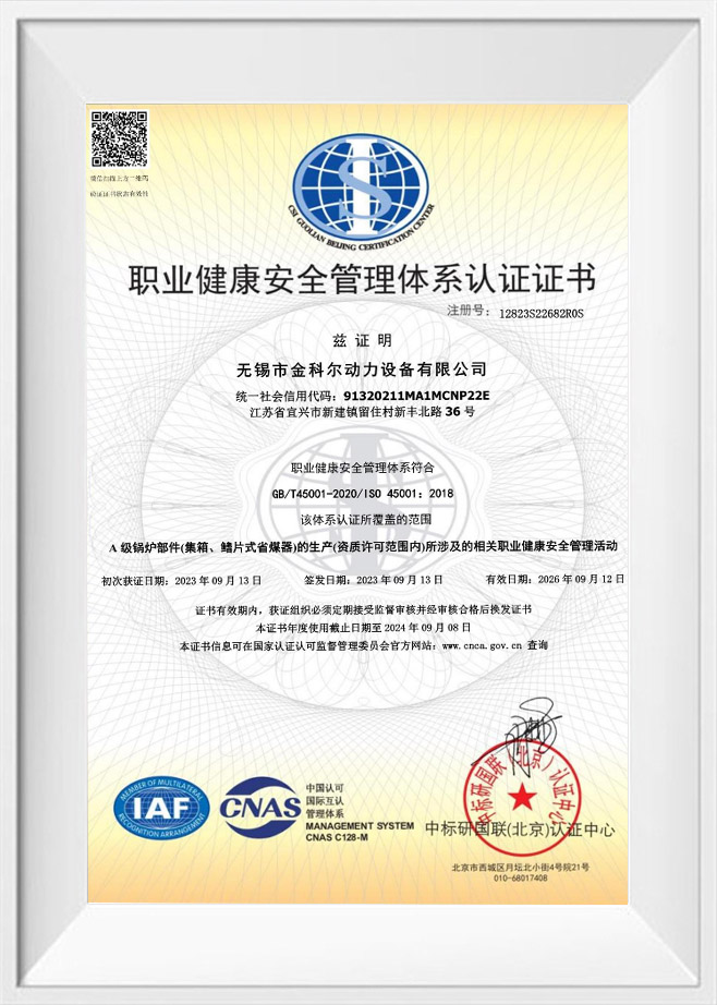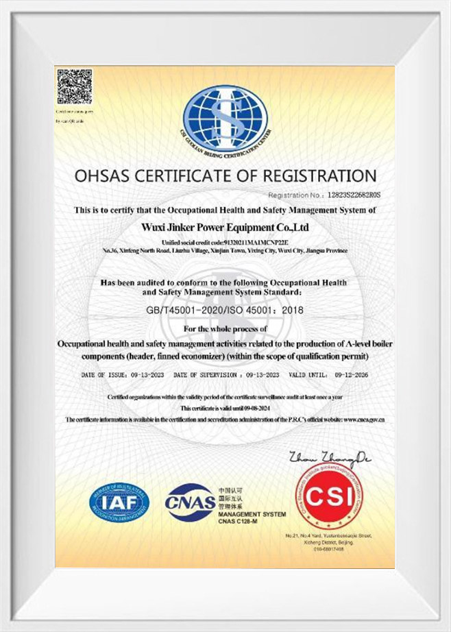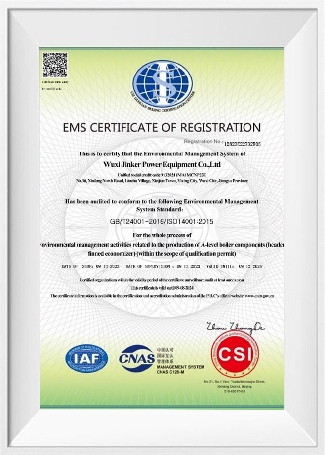 Vi er en virksomhed med en fremstillingslicens for kedeldele på niveau A (header, fuel economizer), en ASME-S-kvalifikationsvirksomhed, ISO9001、ISO14001、ISO45001、ISO 3834-2.